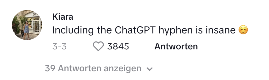 And this is exactly what happened to the em dash: In March 2025, a TikTok user pointed out the “ChatGPT hyphen” (fig.1) in a brand's promotional post (@prettylittlething, 2025). More recently in July 2025, a TikToker (@studywithsawyer, 2025) told a story how he allegedly failed a class due to em dash-related AI accusations1