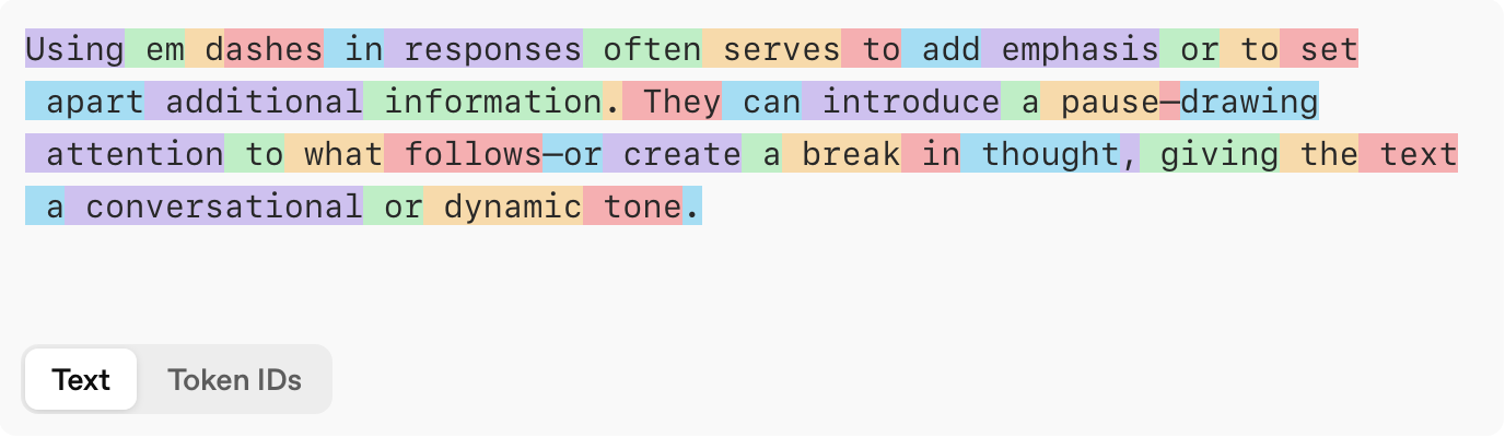 But notice that while there appear to be two em dashes in the humanly readable text that GPT generated. It contains only one ID 2322. The closing—dash is not an em dash as we know it from our language. It is a completely different symbol. It is “—or” with the ID 121630. It is a standalone token, a new linguistic instance.